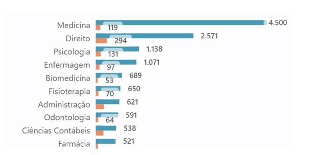 Em seguida, estão direito (2.571 inscritos e 294 pré-selecionados) e psicologia (1.138 inscritos e 131 pré-selecionados).